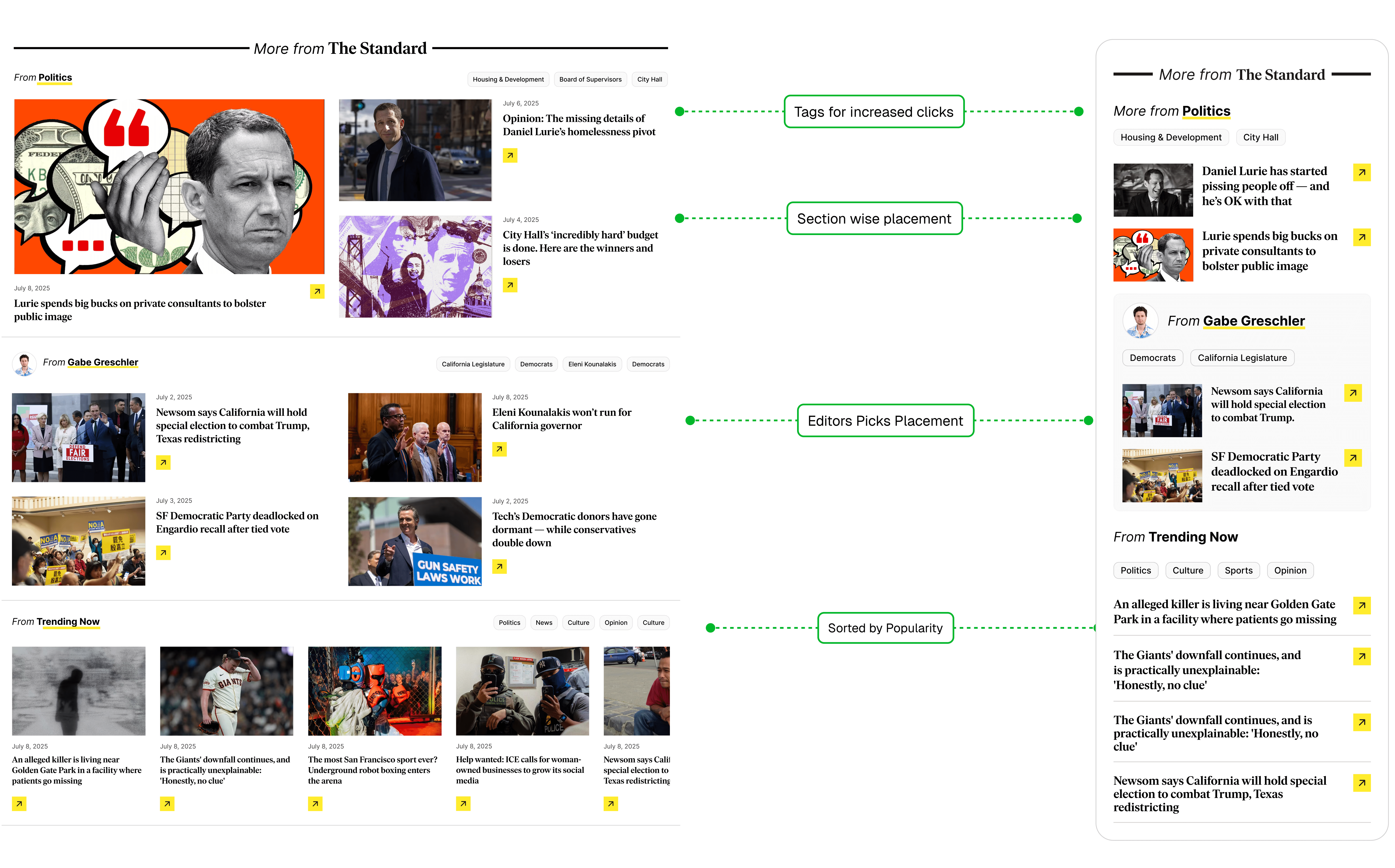 Uses real-time analytics (and future personalization) to show relevant stories by author, category, tag, and even podcasts.