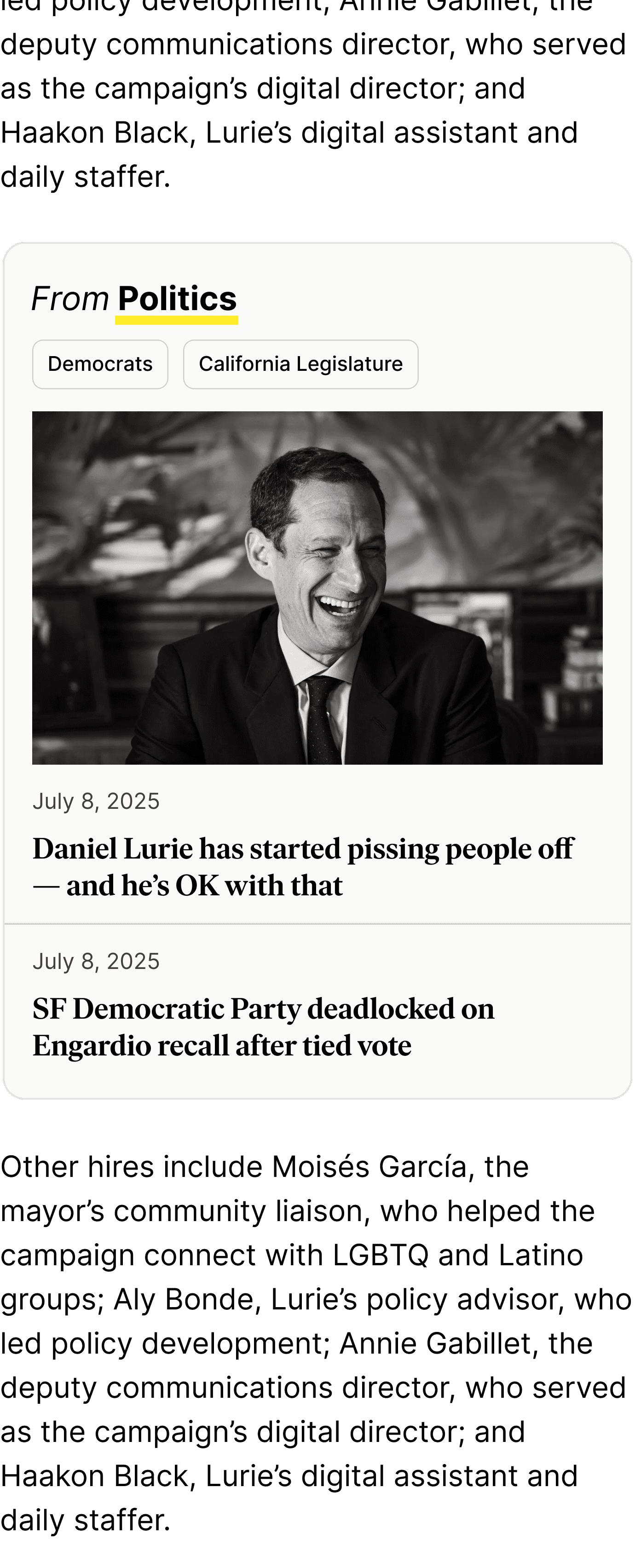 Other hires include Moisés García, the mayor’s community liaison, who helped the campaign connect with LGBTQ and Latino groups; Aly Bonde, Lurie’s policy advisor, who led policy development; Annie Gabillet, the deputy communications director, who served as the campaign’s digital director; and Haakon Black, Lurie’s digital assistant and daily staffer.