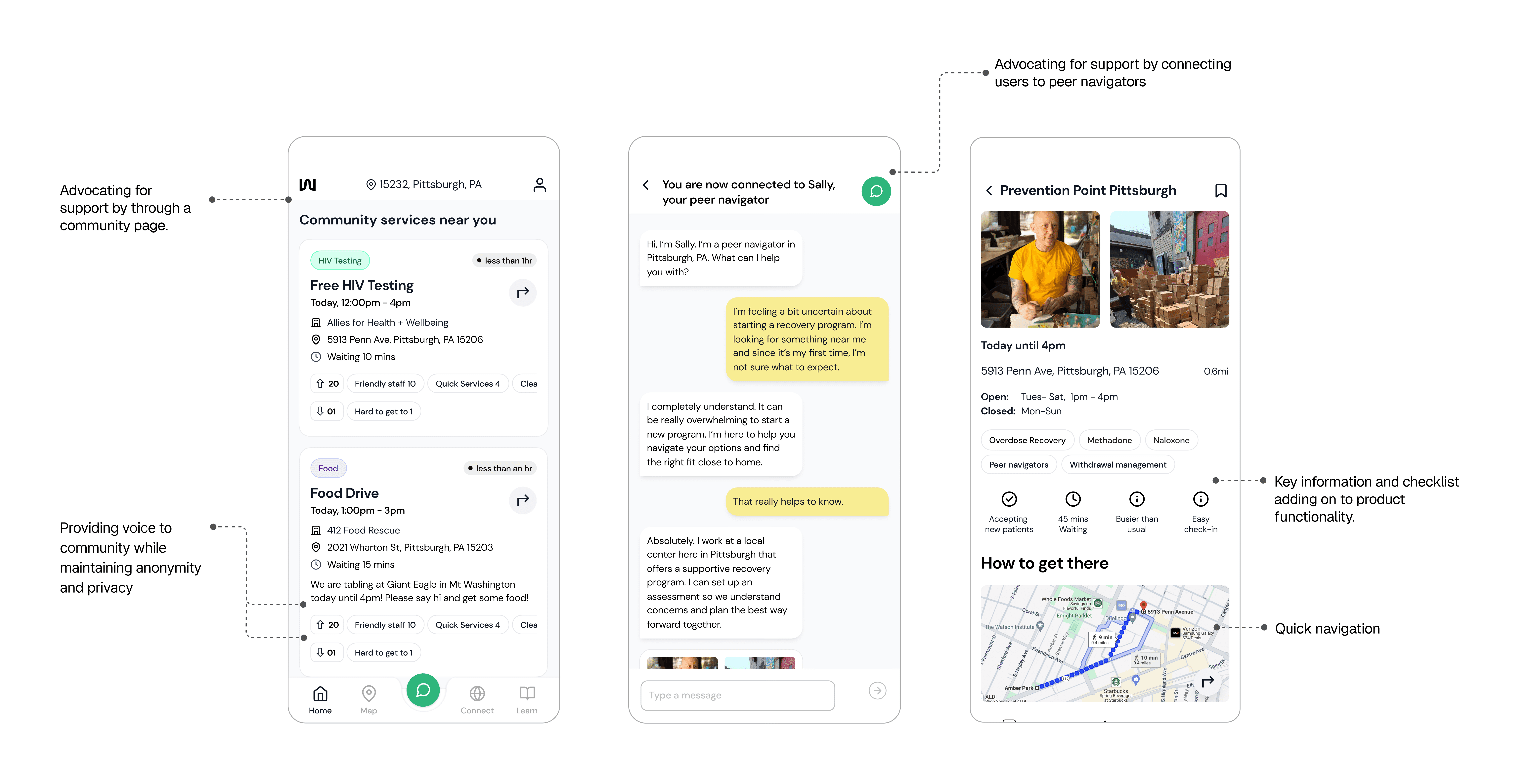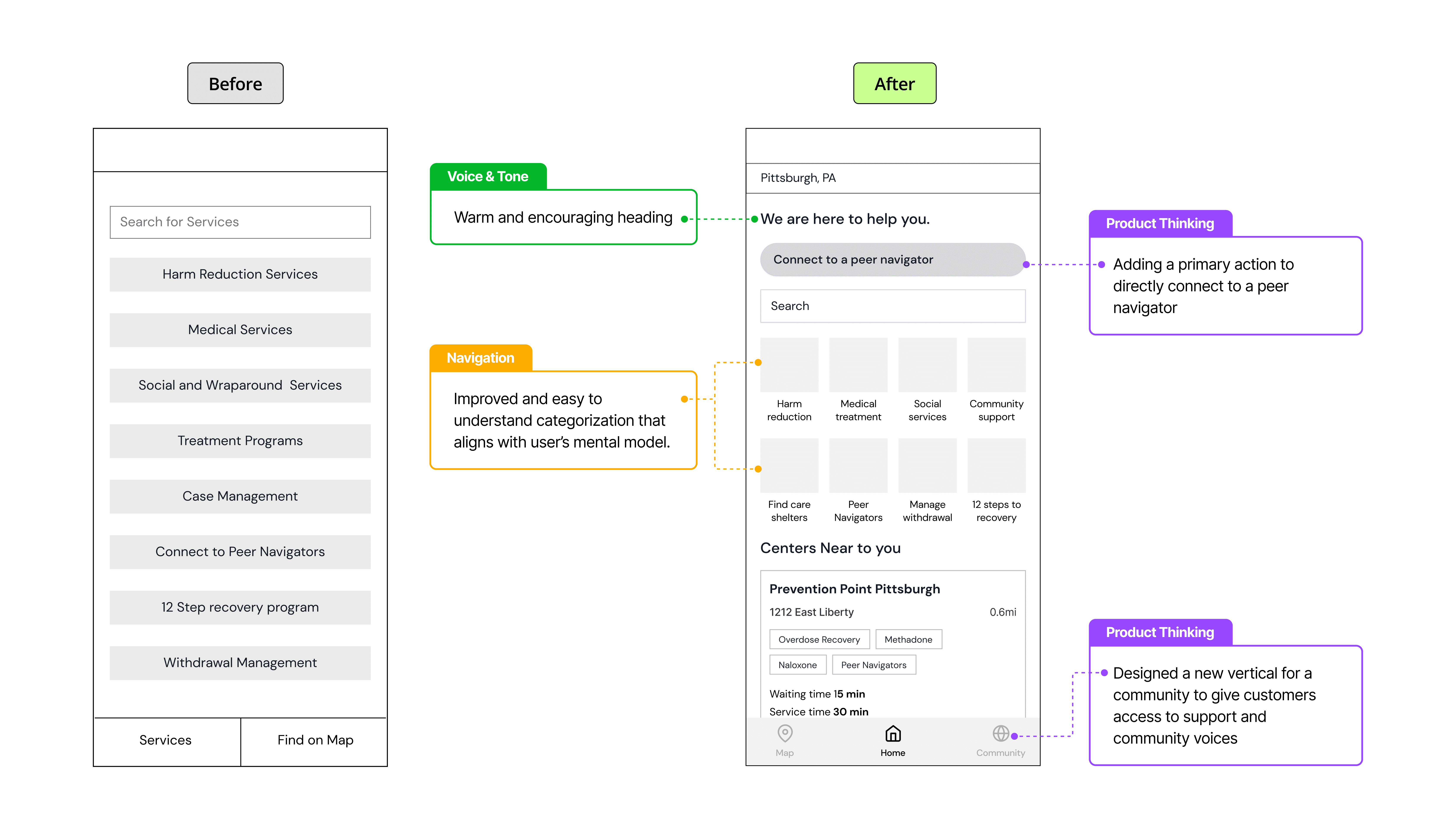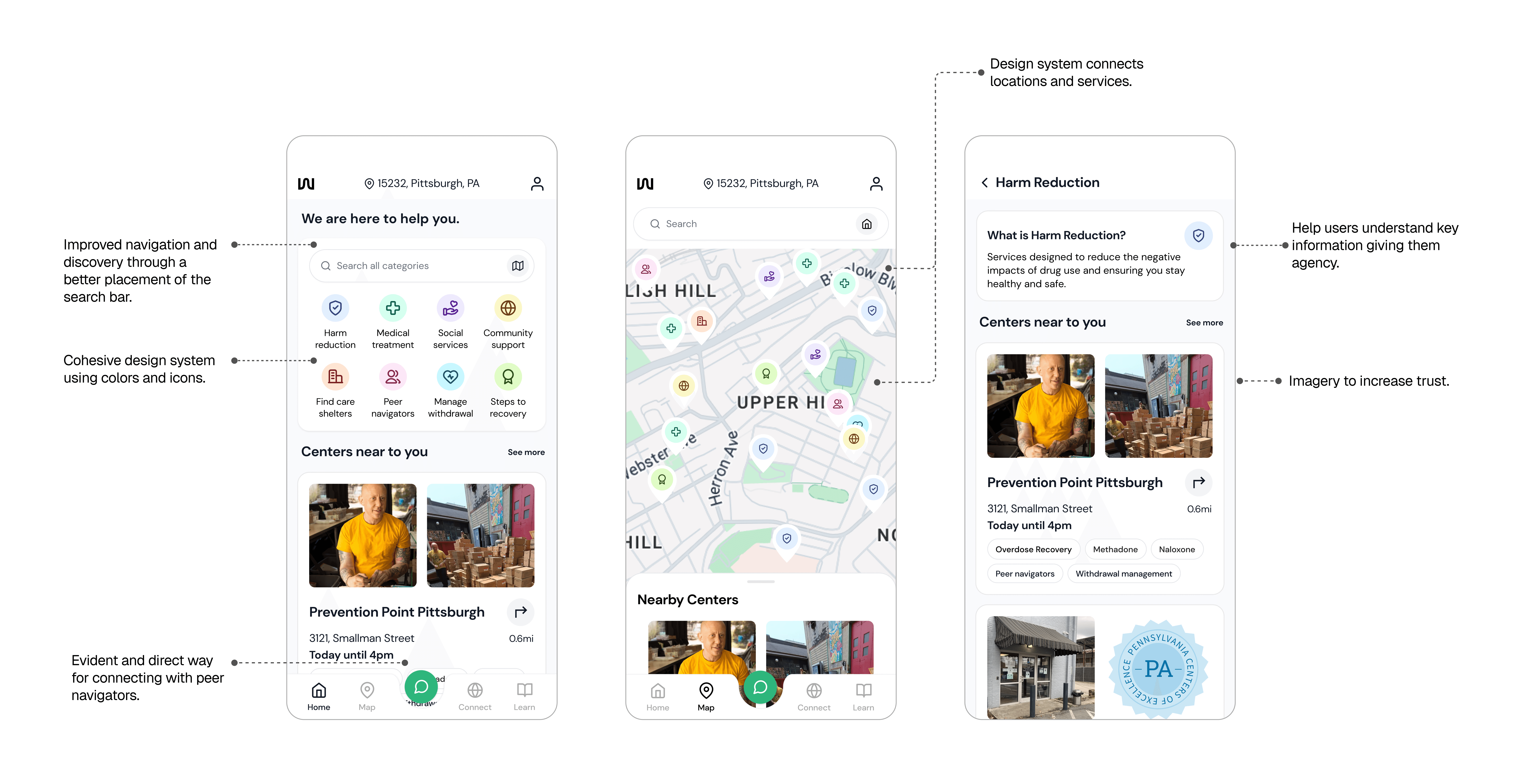 A service design collaboration with UPMC and local Pittsburgh community organizations. Partnering with Paul Jaudrey, a medical specialist at UPMC, we designed a mobile app proposal to help people navigate local harm reduction services.