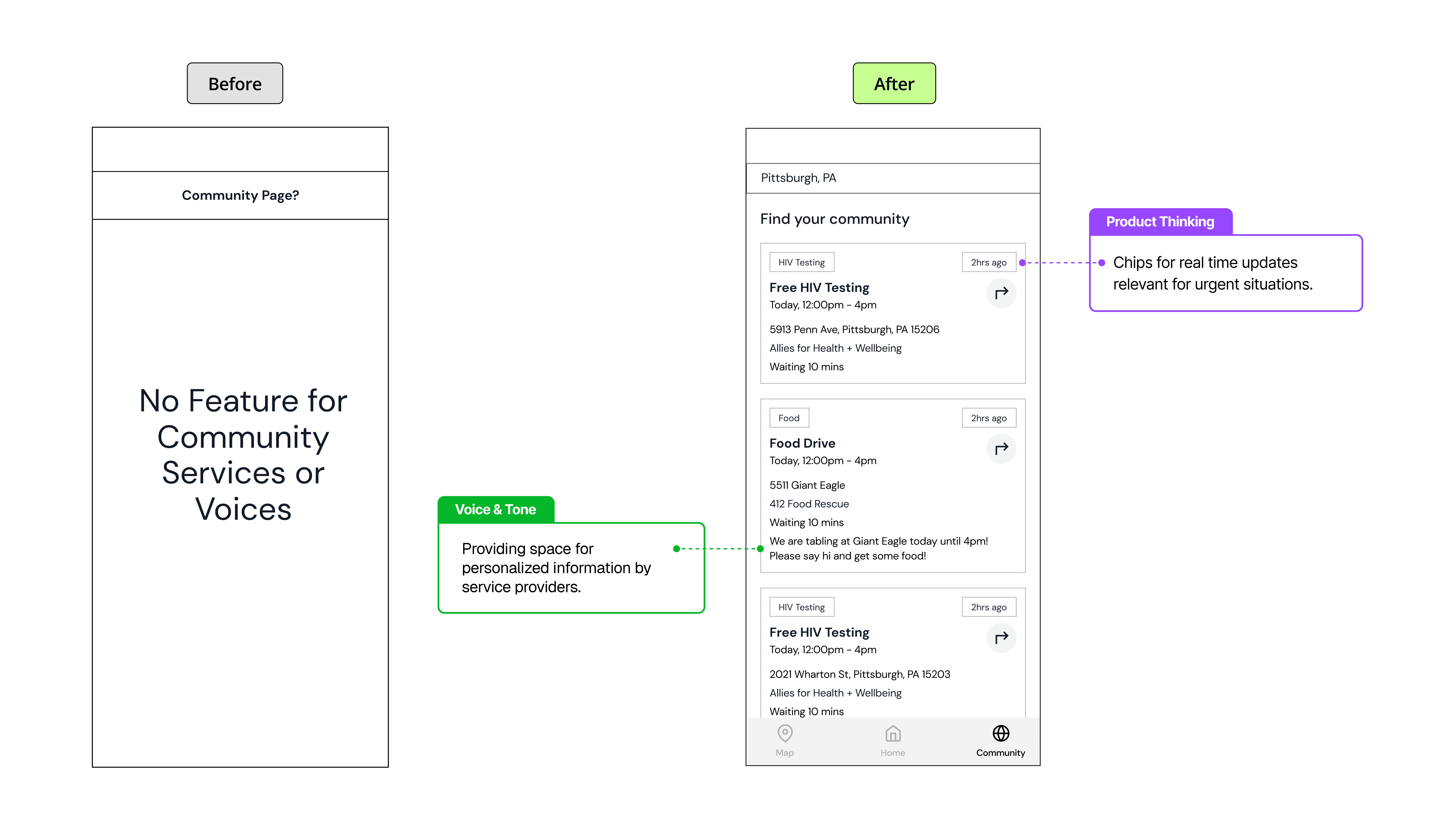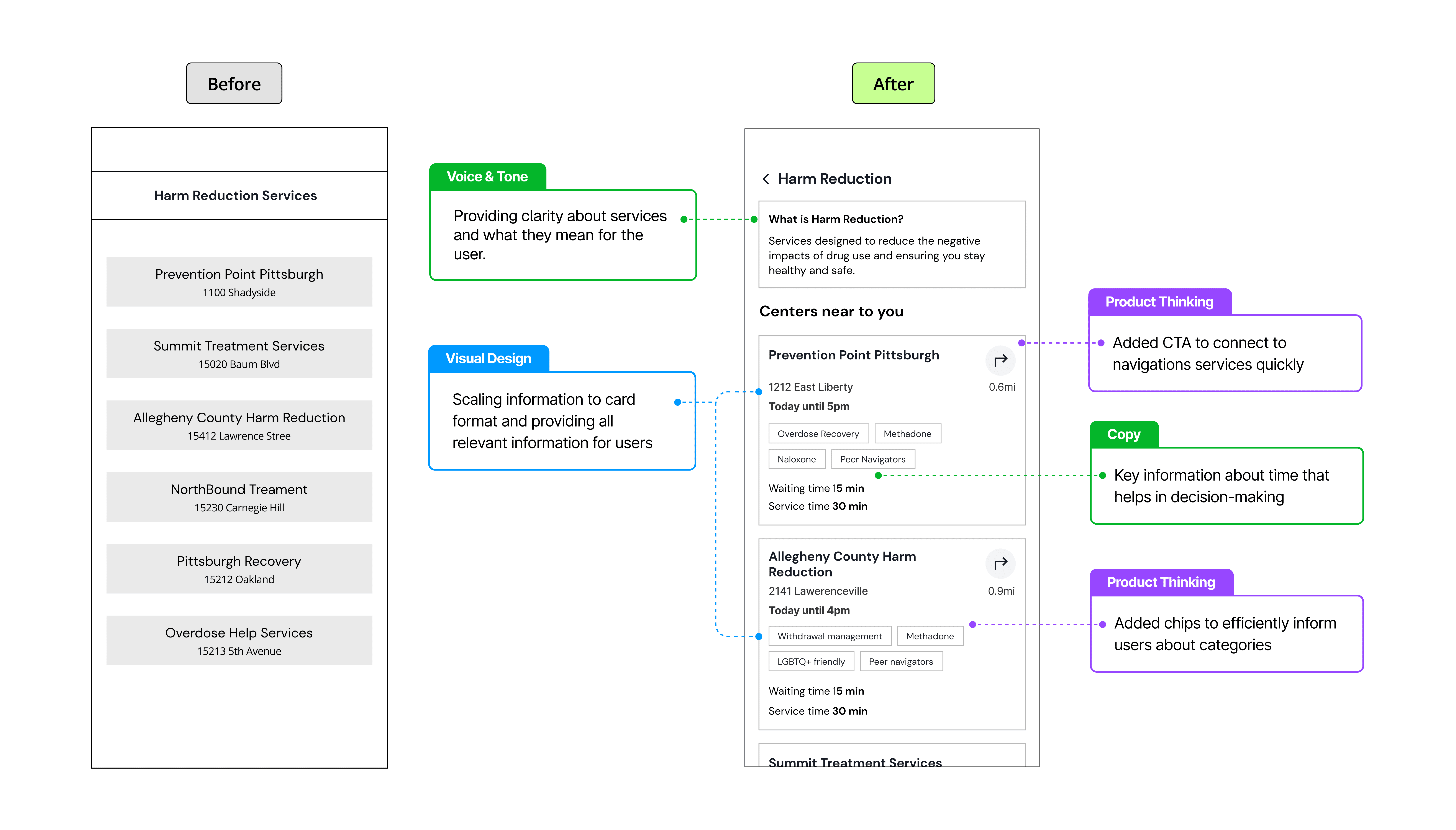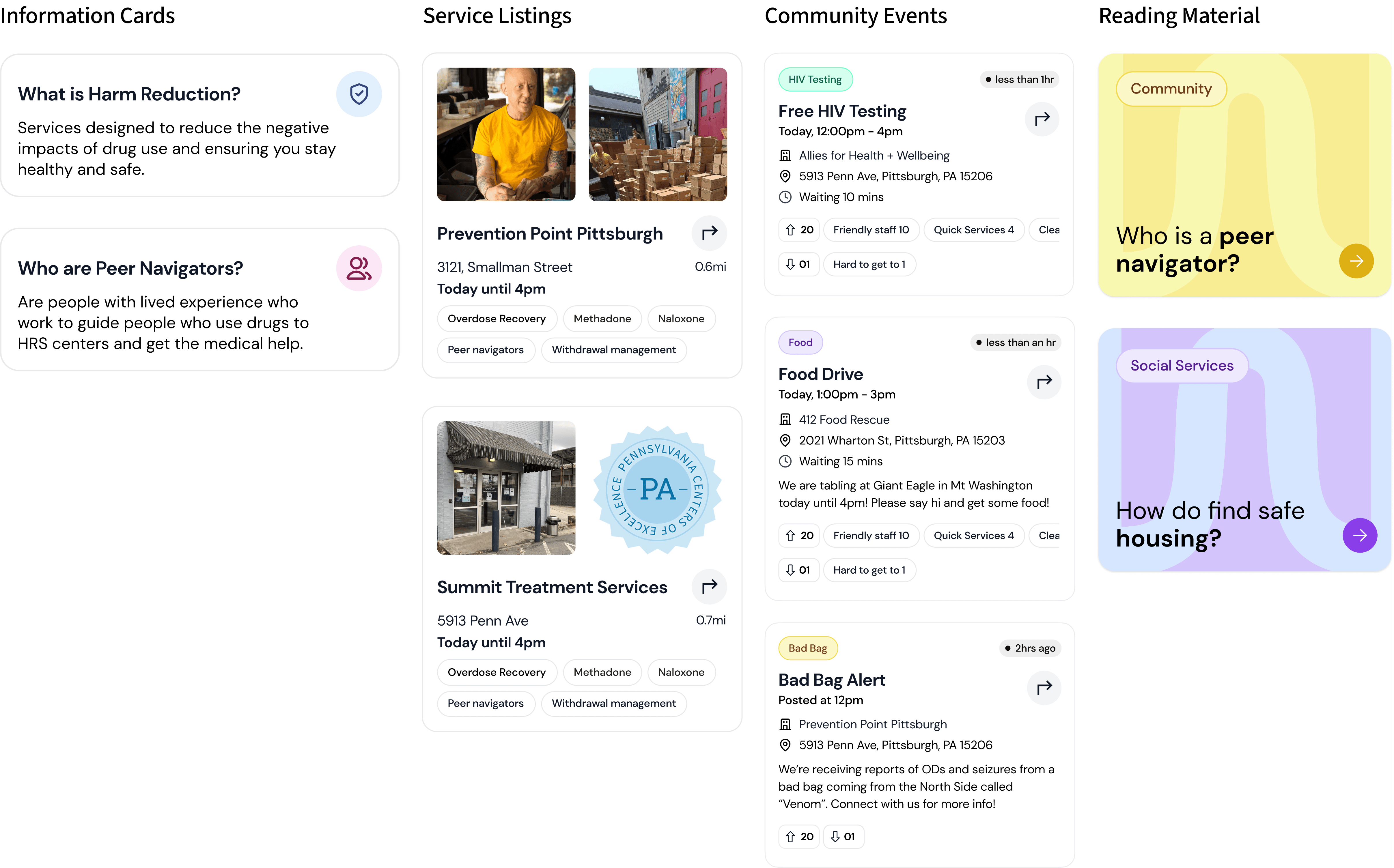 A service design collaboration with UPMC and local Pittsburgh community organizations. Partnering with Paul Jaudrey, a medical specialist at UPMC, we designed a mobile app proposal to help people navigate local harm reduction services.