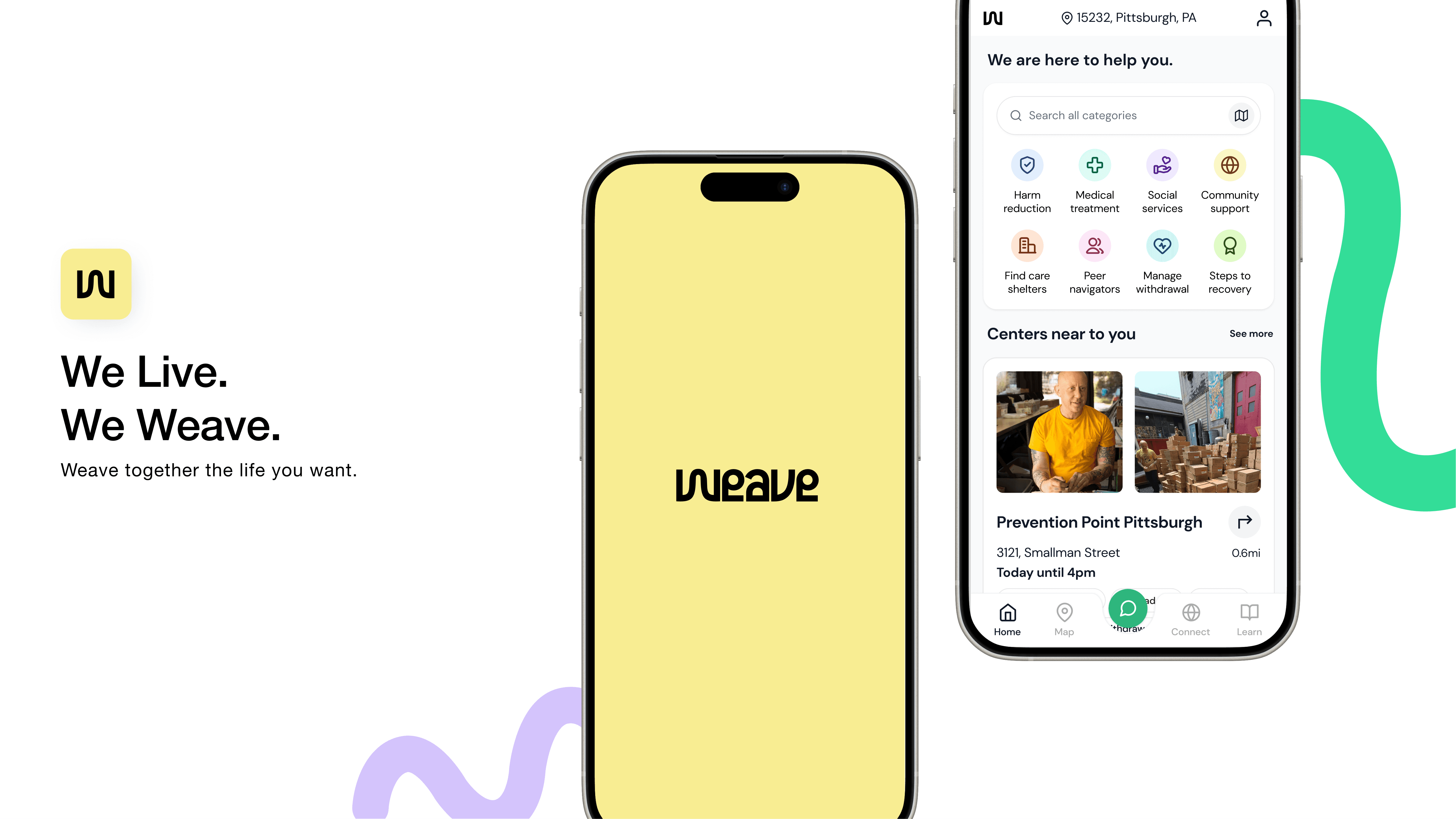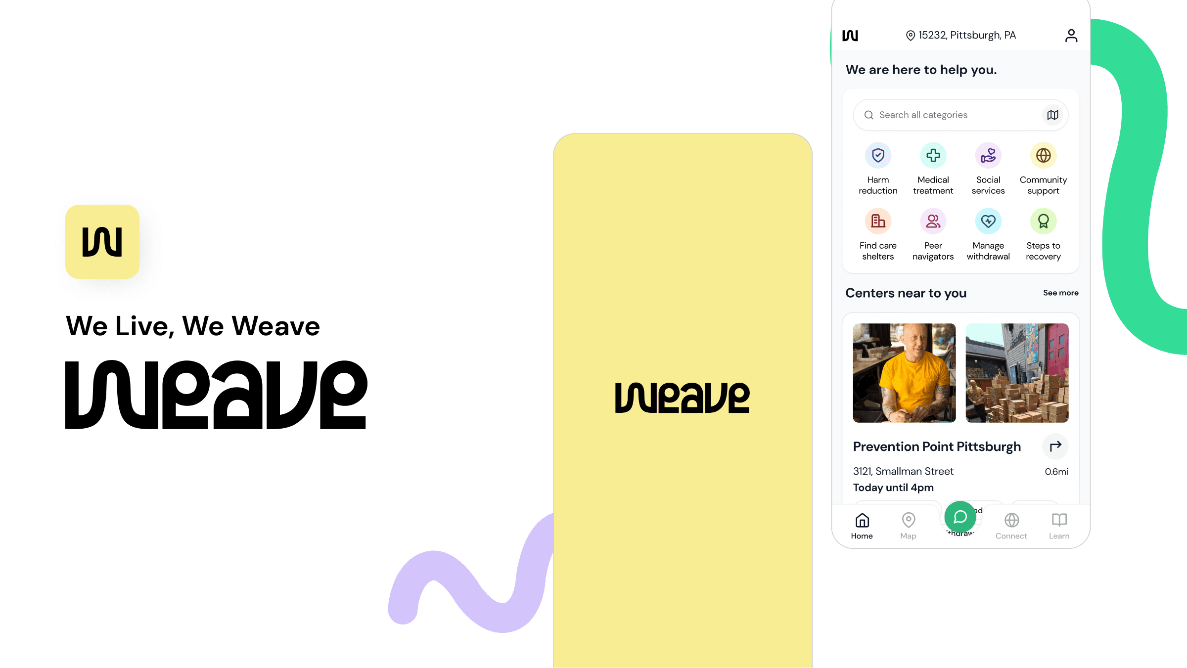 Weave connects diverse users to harm reduction services with the transparent, easy access, and judgement-free information. Using interchangeable map and list view, users can easily navigate and learn about service centers.