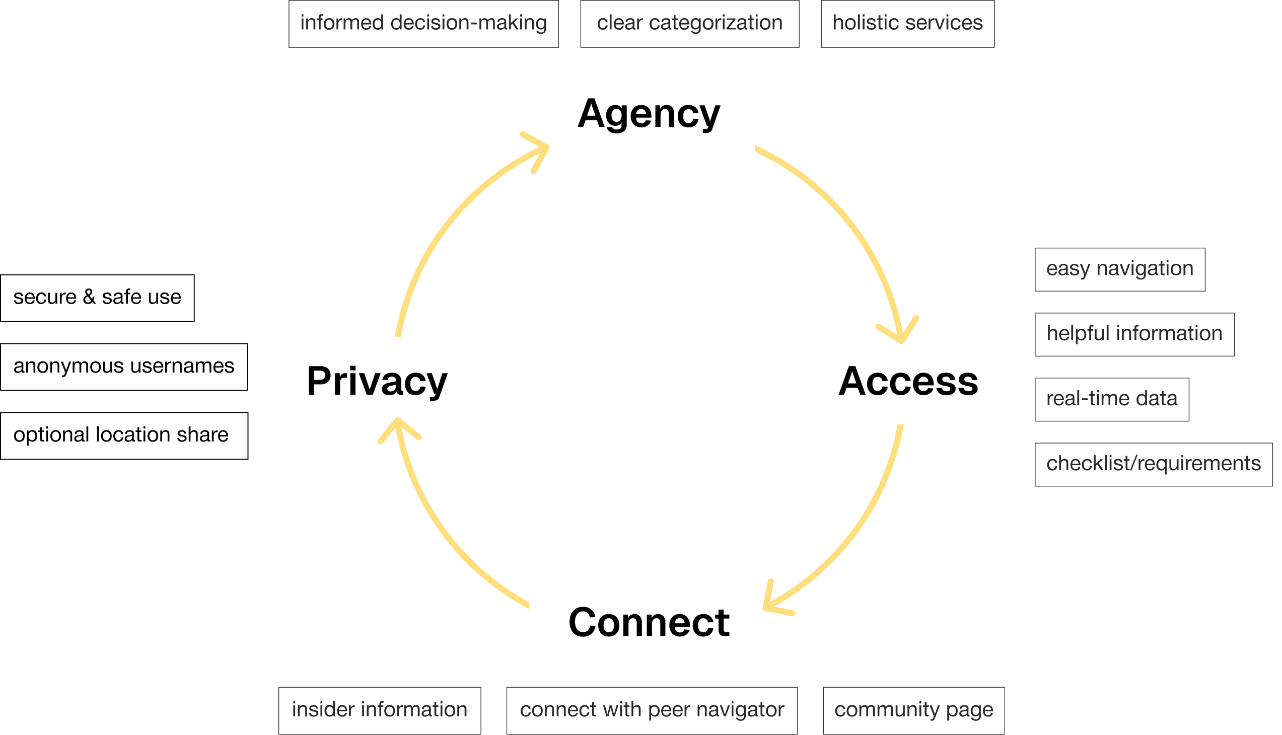 We centered the values of the app around accessibility, agency and privacy to create a safe space for our audience to connect with local services with the end goal of improving their life quality as a whole. We used our values to define the main features and structure of our final product.
